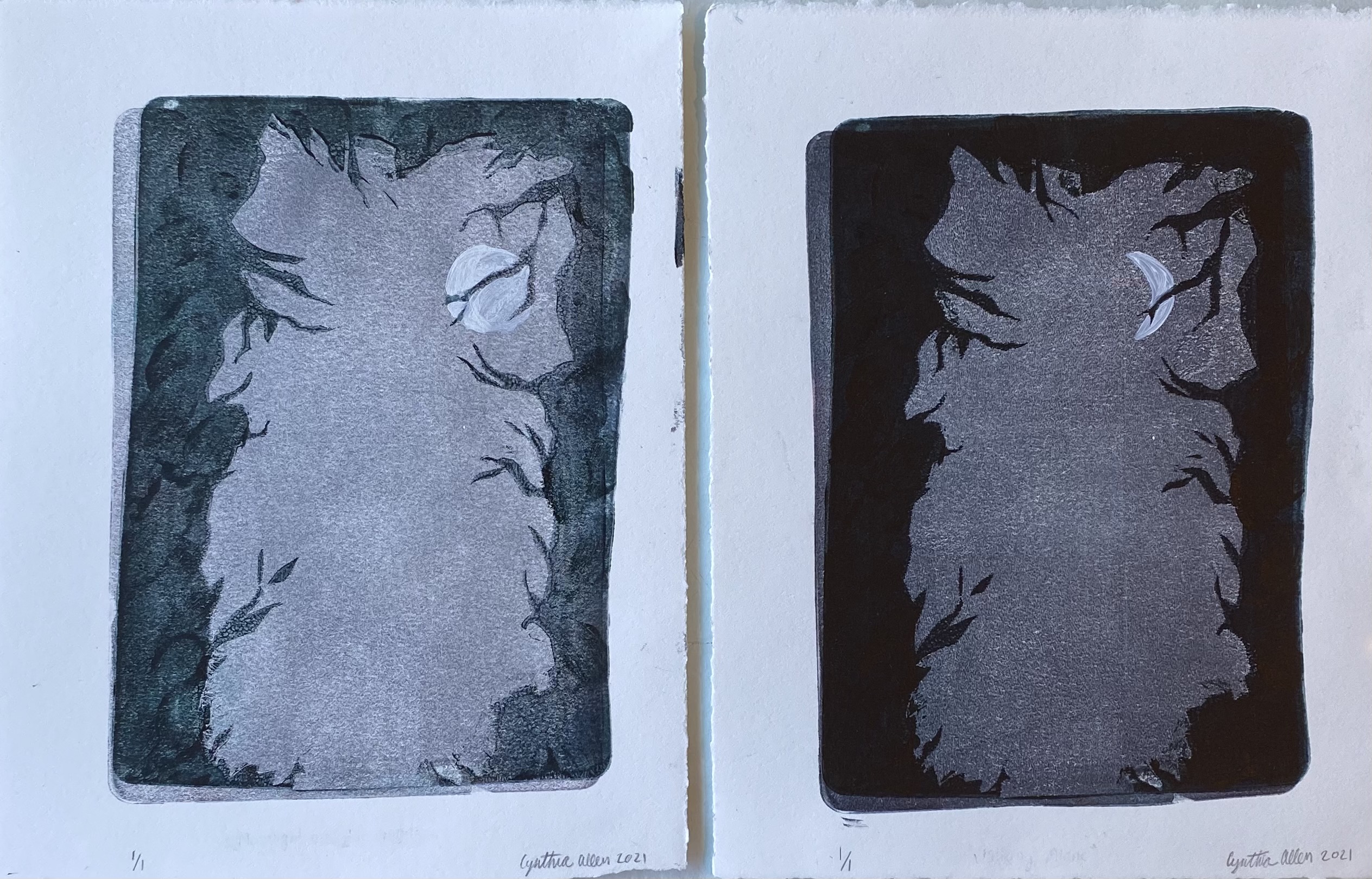 The mono prints featured above were based off of the prompt “greatest fear.” I chose to do my prints around the idea of being lost alone in the woods.